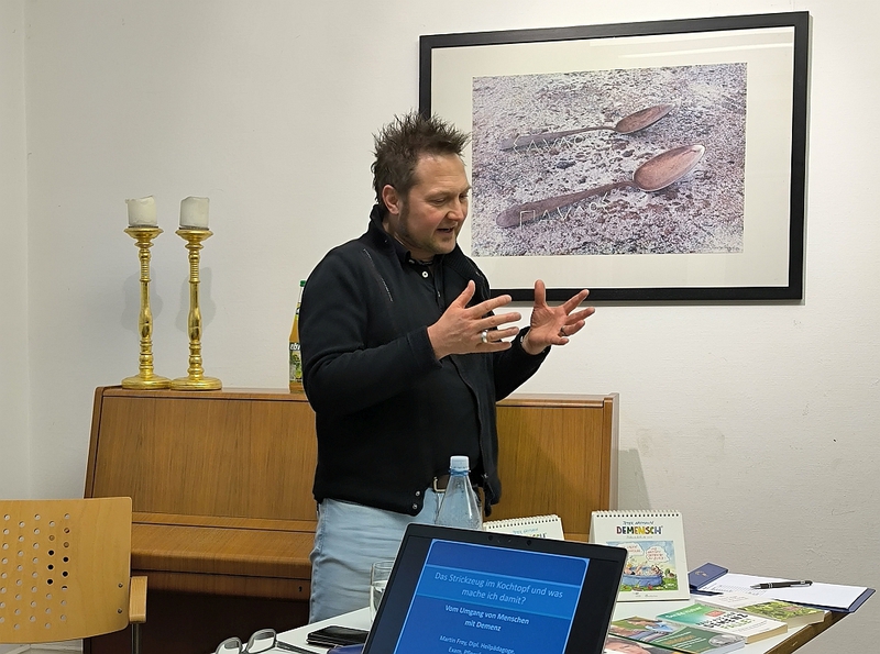 Martin Frey ging zunächst auf die Formen von Demenz ein. Die häufigste Form ist Alzheimer (60–70 %), gefolgt von vaskulärer Demenz (ca. 15 %), Frontotemporale Demenz (ca. 3–9 %), Lewy-Körperchen-Demenz (ca. 5 %) und Parkinson-Demenz. Anschließend führte er aus, woher die Demenz kommt, wie man vorbeugt und was man dagegen tun kann. Er verdeutlichte, in welcher Gefühlswelt dementielle erkrankte Menschen leben und gab wichtige Anregungen, wie Verwandte, Freunde und Pflegekräfte diesen Menschen begegnen und mit ihnen reden sollten. Mit einer guten Betreuung kann der Alltag für die Betroffenen erheblich erleichtert werden. Alle Anwesenden waren begeistert vom kompetenten Vortrag, der zum Nachdenken anregte.